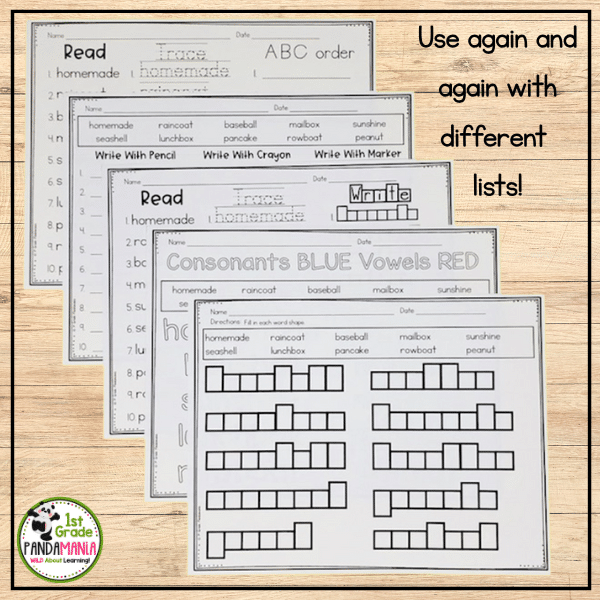 Just type your spelling or sight words onto the first page and the words auto-fill onto all the following: