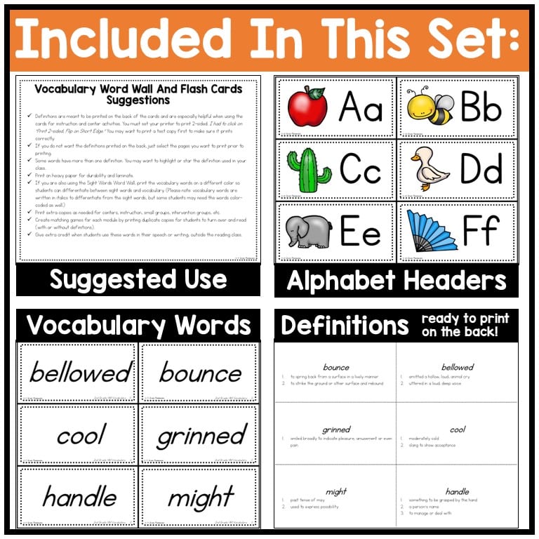 Post these 240 easy to print, laminate and cut HMH Into Reading Structured Literacy 2nd grade vocab words with definitions on the back for your word wall. Put them on rings for students to practice daily. Use them as flashcards in small group, whole group, interventions, and send home for practice. They can also be used for introducing/instruction for your weekly vocab words, parent helpers, center games (matching games and ZAP!), or partner practice! Each card is 2.8″ x 5.45″ in size. These words are organized by modules—print and file by the weekly lesson.