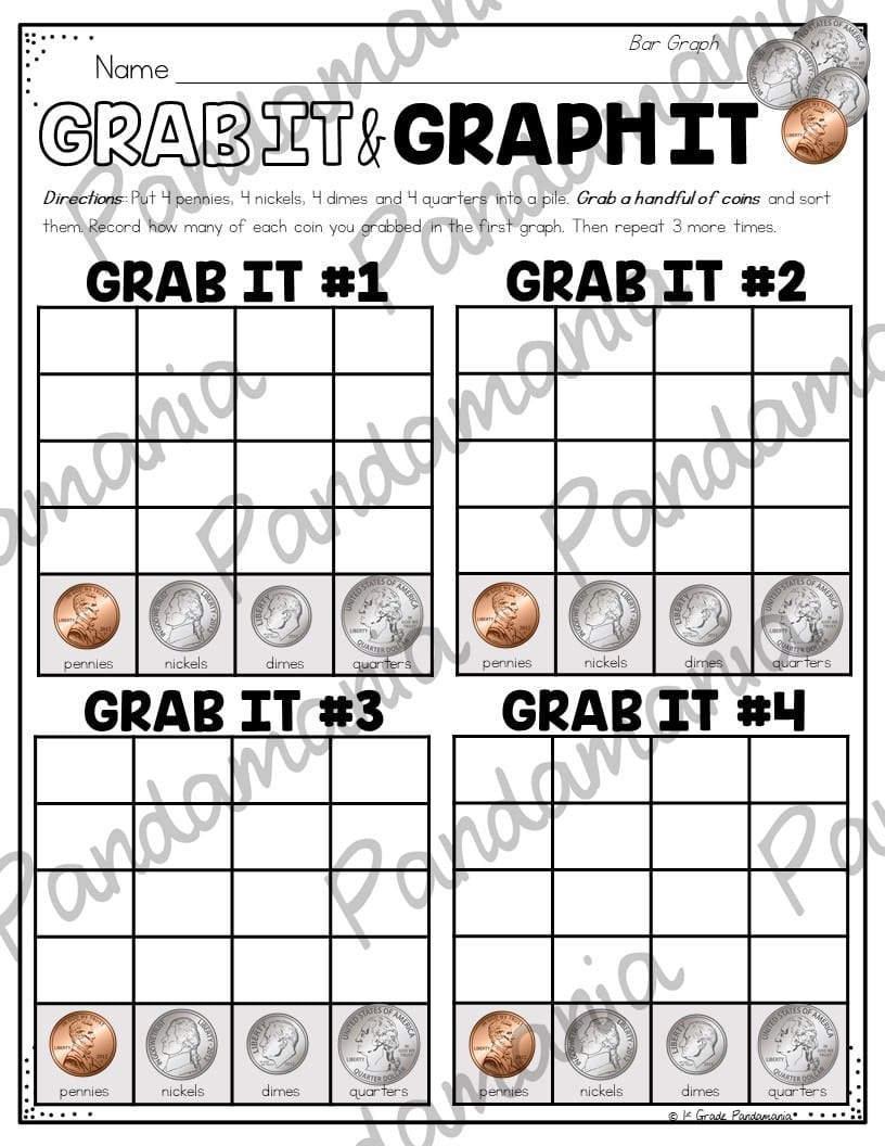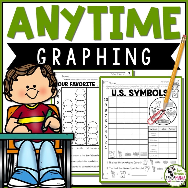 1st graders love working on these graphing activity worksheets (US and Canadian/UK Versions) anytime during the year. Use them for math centers, small-group instruction, and whole-group math lessons. These graphs practice a variety of instructional strategies including basic pictographs, pie charts, bar graphing, tallies, counting, sorting, adding, subtracting, comparing and more!