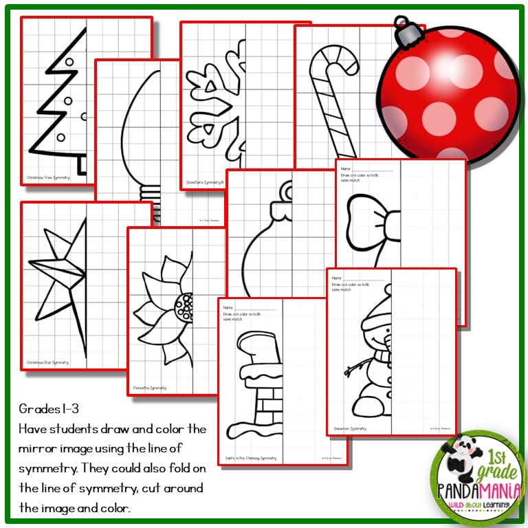This math Christmas art activity with symmetry is perfect for grades 1-3 and a great addition to any math center, early finishers, morning work, or holiday art activity. Students use the grid provided to draw the mirror half of the holiday image. The teacher may want to model how to use the grid and complete one image together with the class.