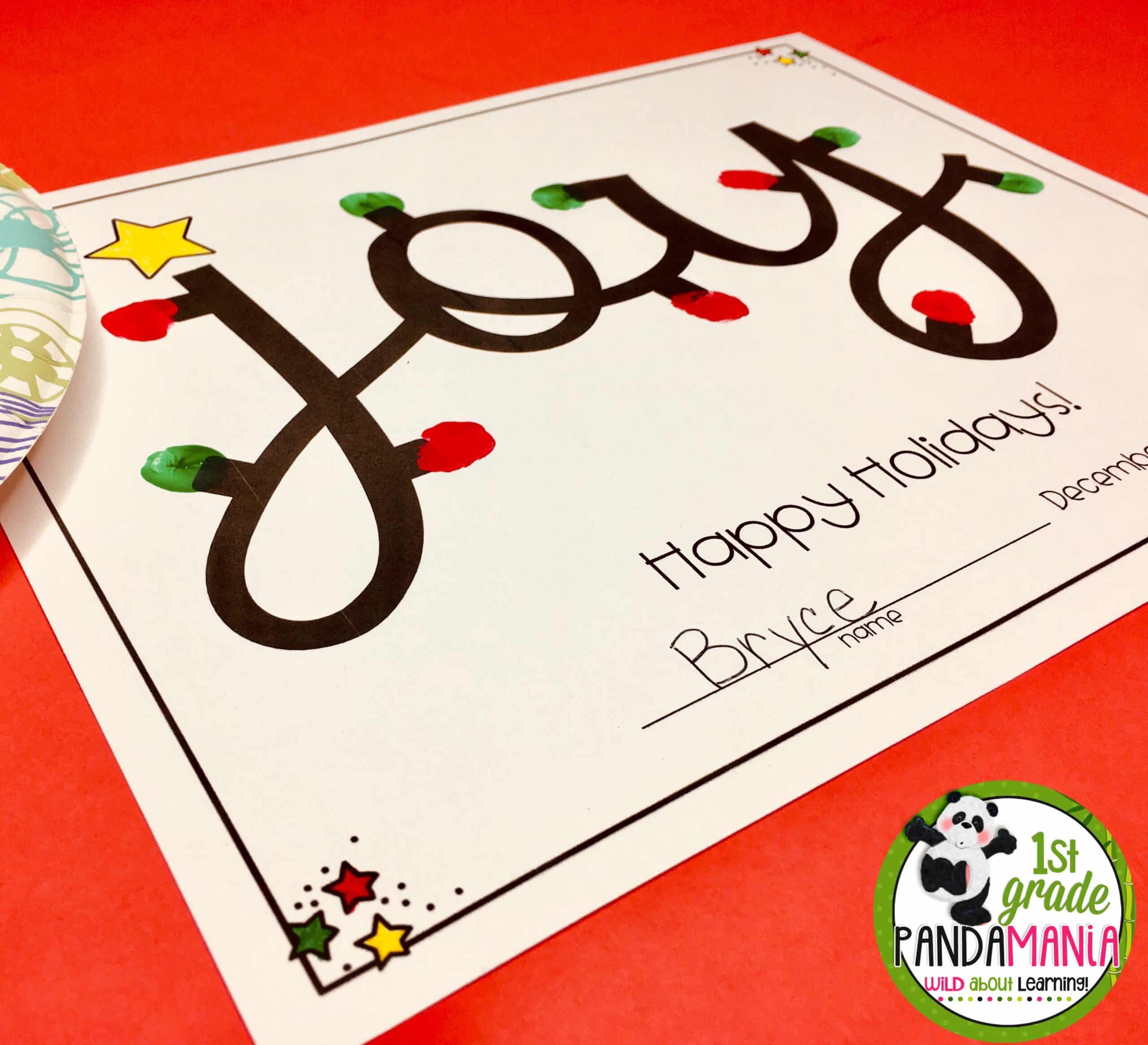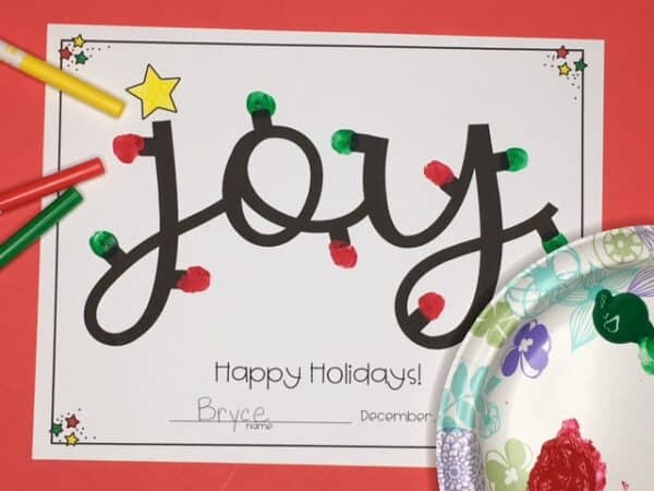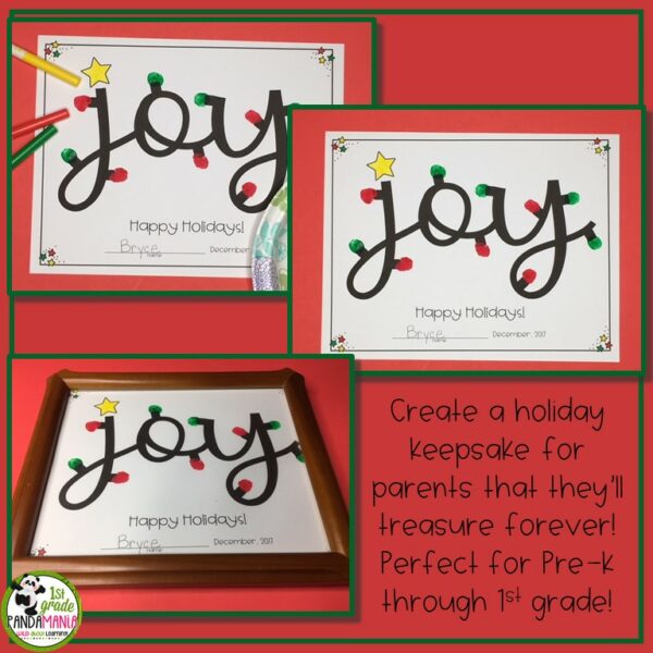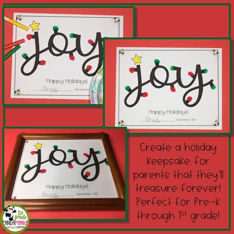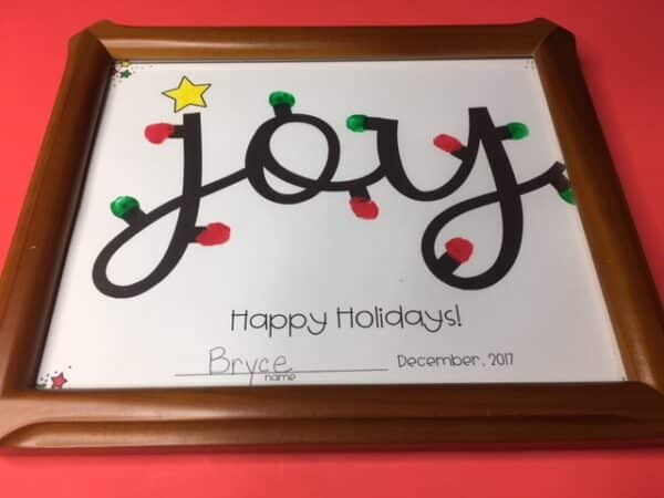 This easy-to-make Christmas gift for parents is perfect for pre-K through 1st grade and is a beautiful gift young students can give their parents for the holidays. Their fingerprints dipped in paint are the holiday lights around the word JOY. It looks amazing when framed!