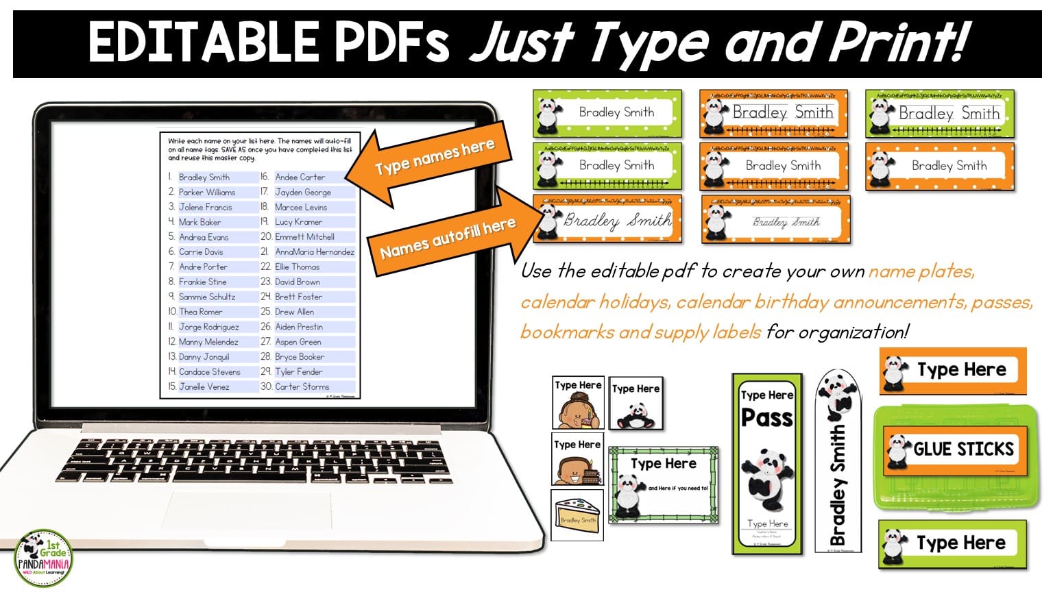 - NEW! Name plates in print and cursive EDITABLE in PDF format. Just type class list OR other classroom label names and name tags auto-fill!