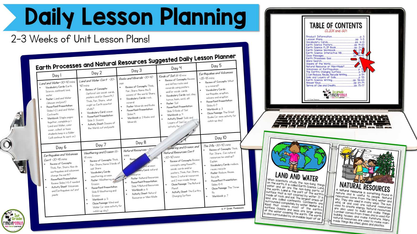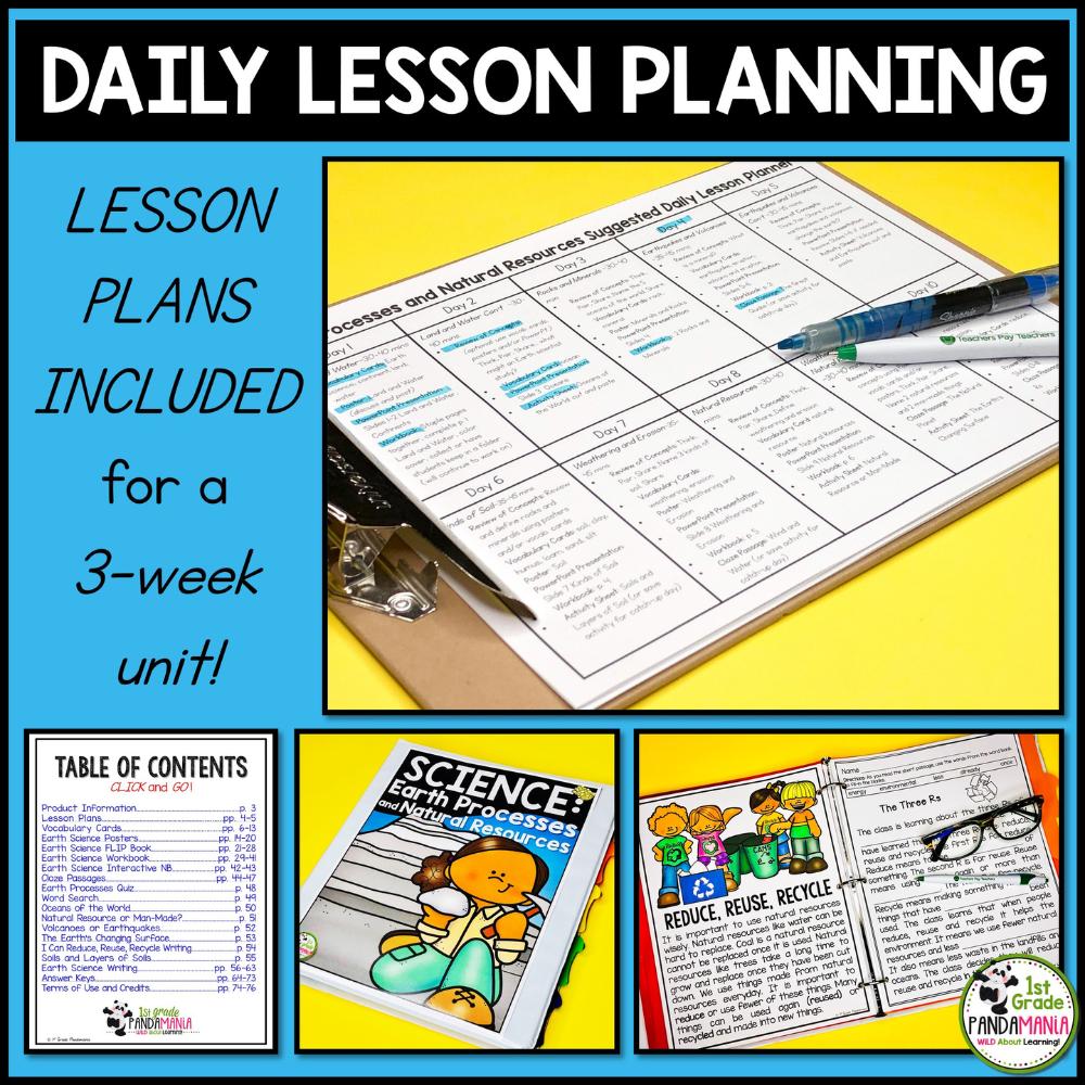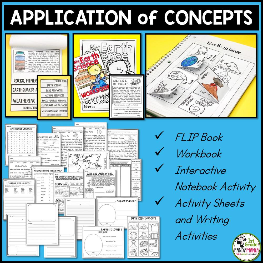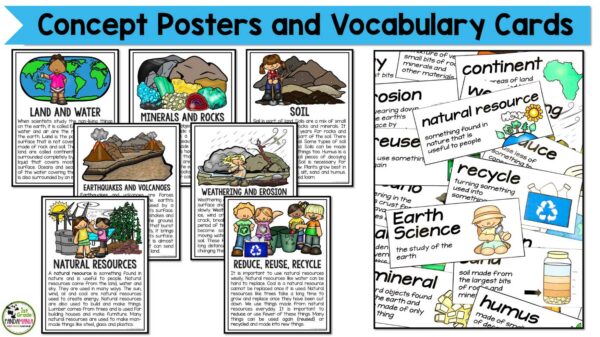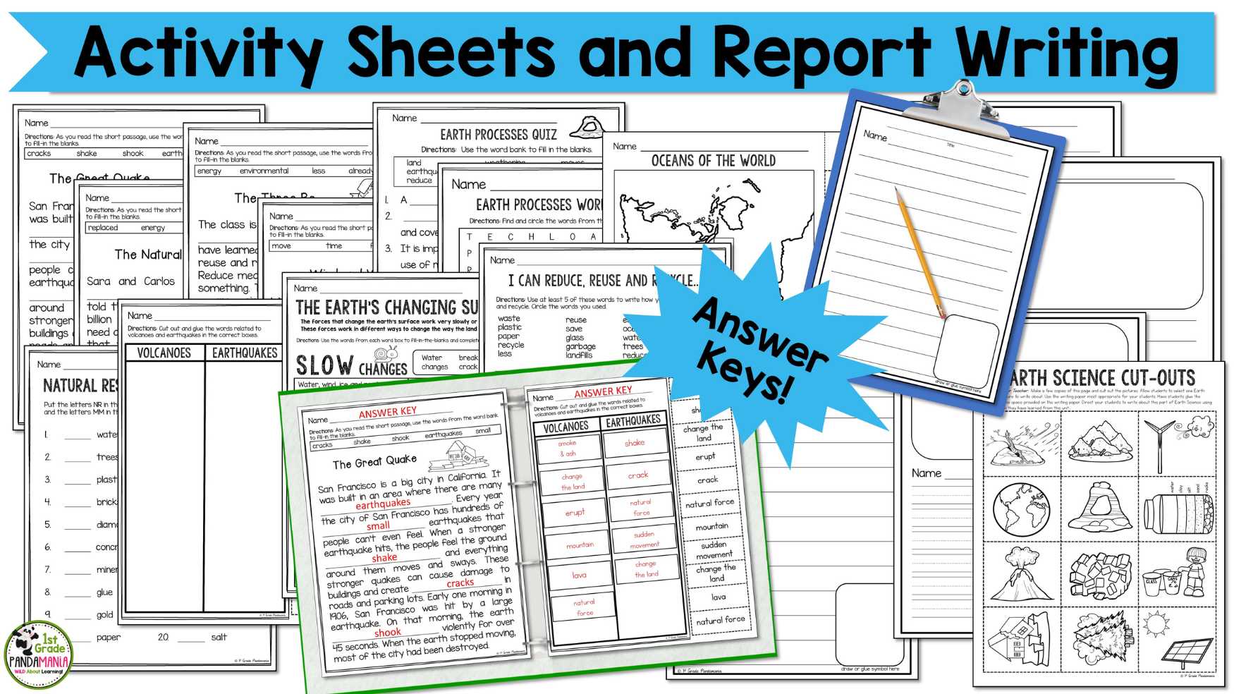 Students will learn about simple earth science concepts including land and water, natural resources, rocks, minerals, soil, earthquakes, volcanoes, weathering, and erosion. The packet also includes the concepts of Reduce, Reuse, and Recycle.