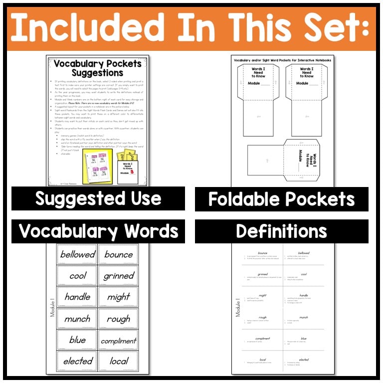 These fun and engaging vocabulary pockets will be used all year long to practice HMH Into Reading 2nd Grade vocabulary words and their definitions. Included are all 12 modules 36 weeks of HMH Into Reading 2nd Grade vocabulary words on flashcards with definitions on the back for your students to practice and store in pockets in interactive notebooks. These flashcards are organized and labeled by modules and weeks. Print and file by the weekly lesson. Just grab and go!