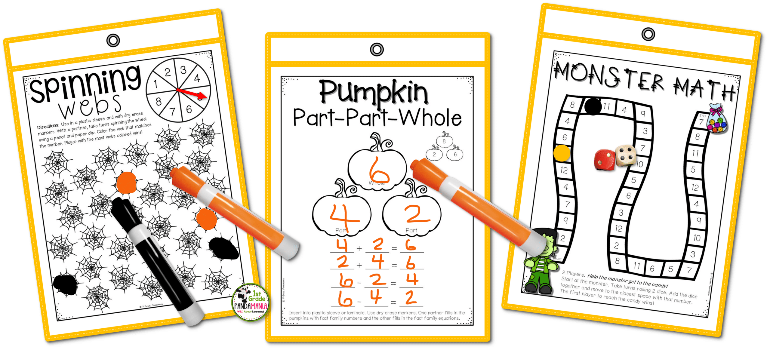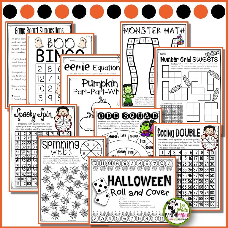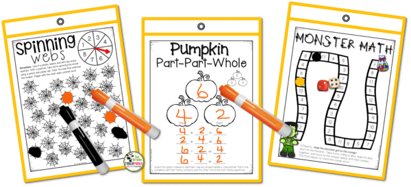 These Halloween Math Activities Print and Play Games, Centers for 1st grade and 2nd grade are designed to quickly print and slide into sleeves or laminate. Insert game pieces and dice into the plastic sleeves so students can grab and go!