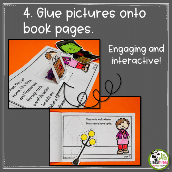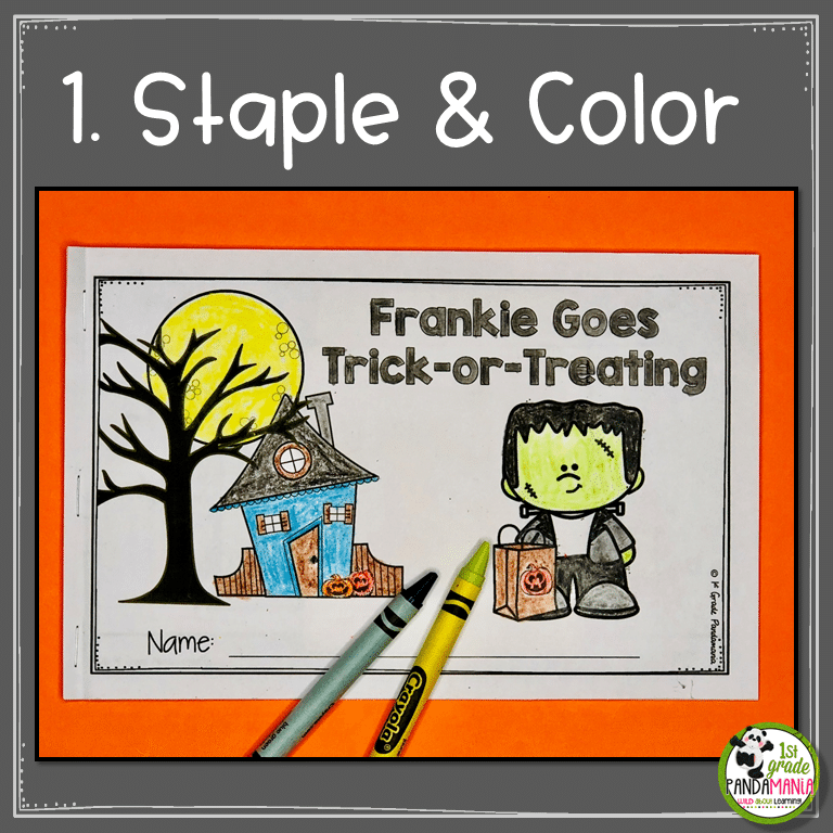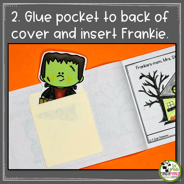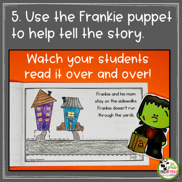 Puppets make reading more INTERACTIVE and FUN. This Halloween reading activity is perfect for Trick or Treating and Halloween safety. Use the Frankie Puppet to help tell the cute story about a boy and his mom, Mrs. Stine, going trick or treating. Store the puppet in a paper pocket (template for paper pocket included) that is glued to the back of the book cover (or use a library book pocket). Watch your students read this Halloween reading activity over and over again!