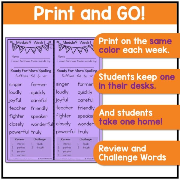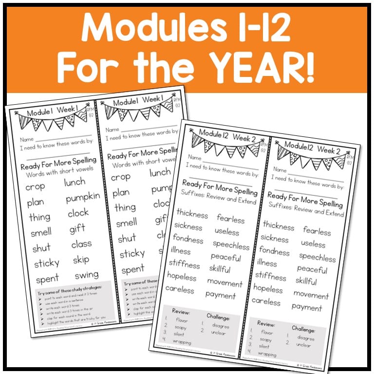 Send these second-grade Ready for More Challenge spelling lists home weekly for students to study all week long with parent help. Post these Ready for More challenge spelling words all year long at centers for practice and have students keep an additional copy of their second-grade spelling words at their seats. These words are organized by modules 1-12. Print and file by the weekly spelling lesson. Just grab and go!
