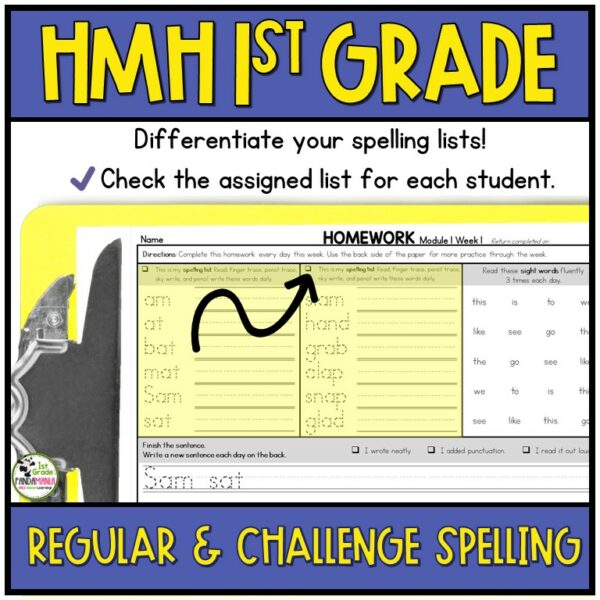 Send HMH Into Reading spelling homework and sight words homework with spelling words, challenge spelling words, high-frequency words, and sentence writing each week, all year long! Included are all 1st Grade HMH Into Reading spelling, and High-Frequency sight words for the year. These words are organized by modules (1.1, 1.2, 1.3 through 12.3.