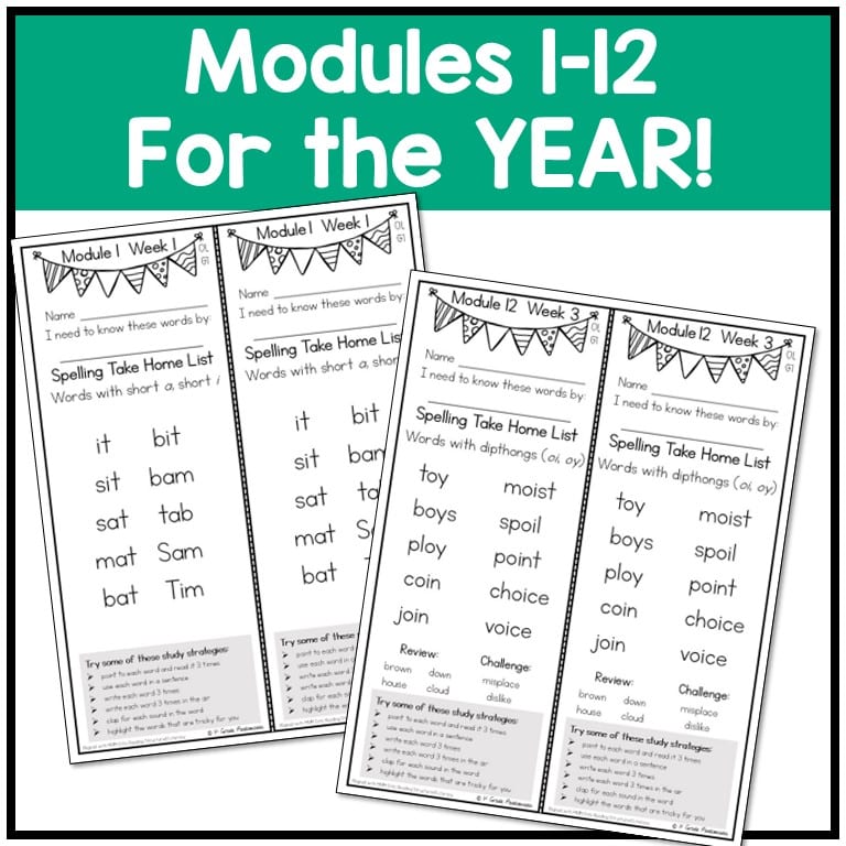 Send these first-grade spelling lists home weekly for students to study all week long with parent help. Post these 1st-grade spelling words all year long at centers for practice and have students keep an additional copy of their first-grade spelling words at their seats. These words are organized by modules 1-12. Print and file by the weekly spelling lesson. Just grab and go!