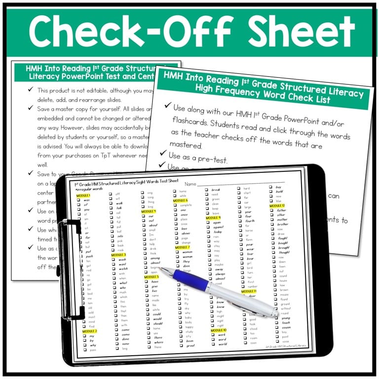 Our students actually enjoy being tested on their HMH Into Reading Structured Literacy 1st grade high frequency words when they control the Powerpoint by pressing the forward button on the computer and read the sight words at their own pace. Check off the words they know on the included student sight word testing sheet. Also, use as a digital center with your Google Drive using Google Slides. Use on a tablet in small group or in reading centers with partners for daily sight word practice. A suggested uses page is included with ideas.