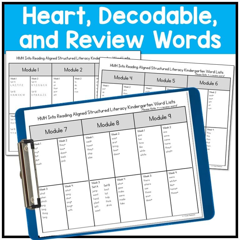 - HMH Into Reading Structured Literacy Kindergarten heart, temporary heart, flash, and review words list for each module