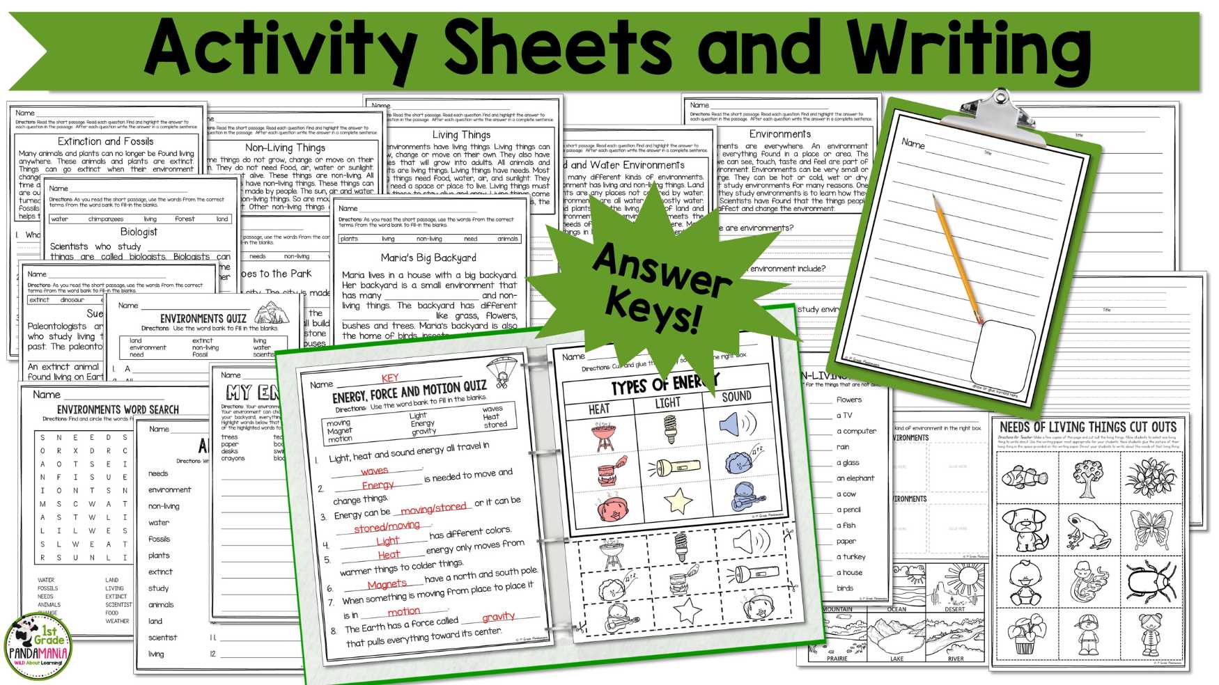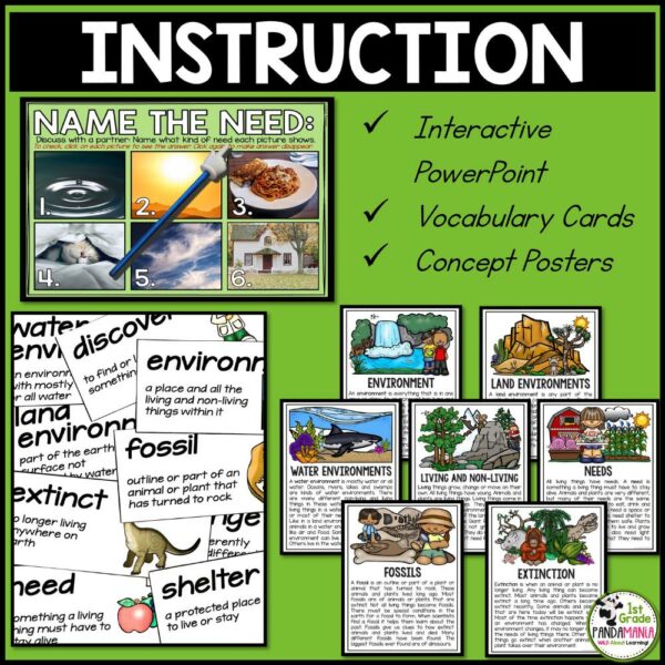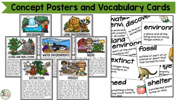 Students will engage in activities related to the topics of land environments, water environments, living, non-living, needs, shelter, change, discovery, extinction, and fossils. The packet is organized in a low-prep and easy-to-use printable format.