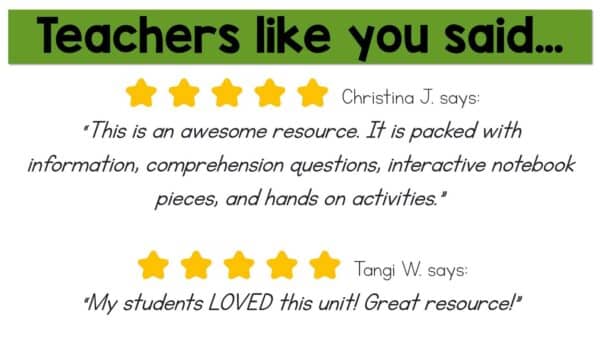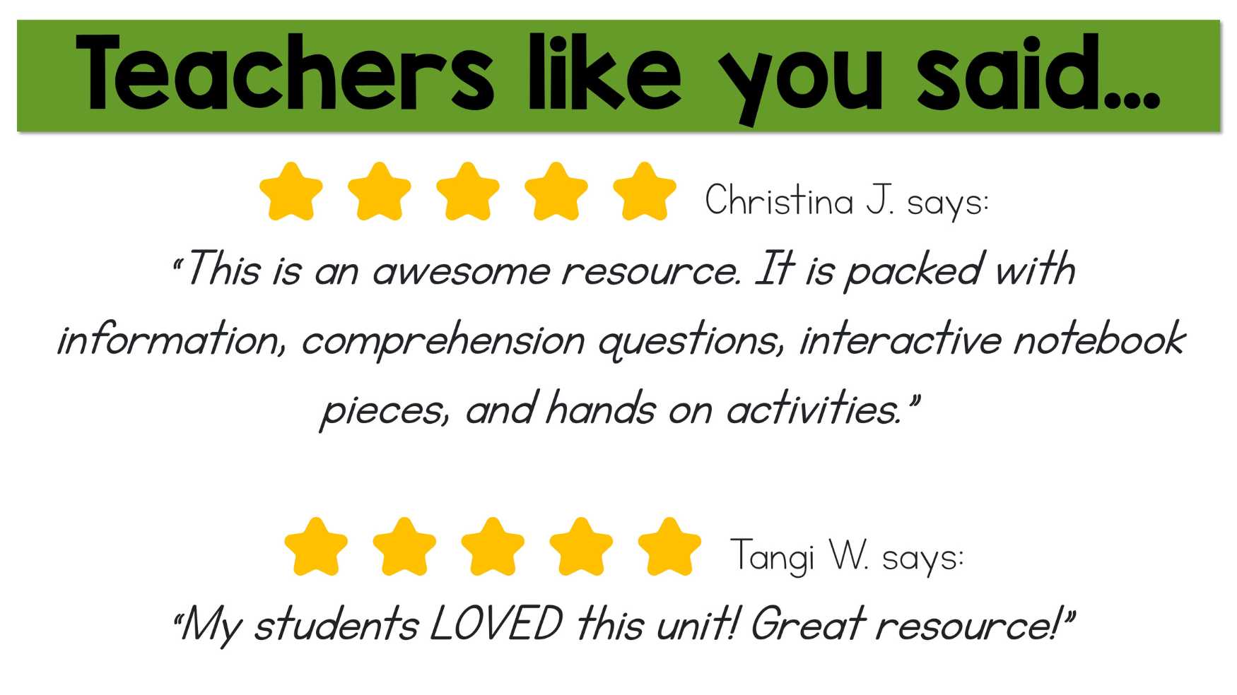 ⭐️⭐️⭐️⭐️⭐️ Christina J. says: “This is an awesome resource. It is packed with information, comprehension questions, interactive notebook pieces, and hands on activities.”