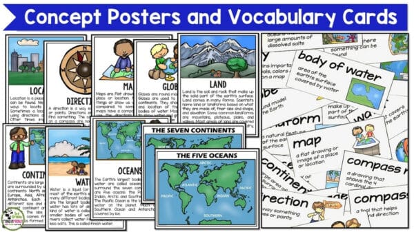 This comprehensive mapping skills unit is aligned with the national social studies standards. It includes the topics of location, directions, maps, globes, continents, oceans, land, and water.