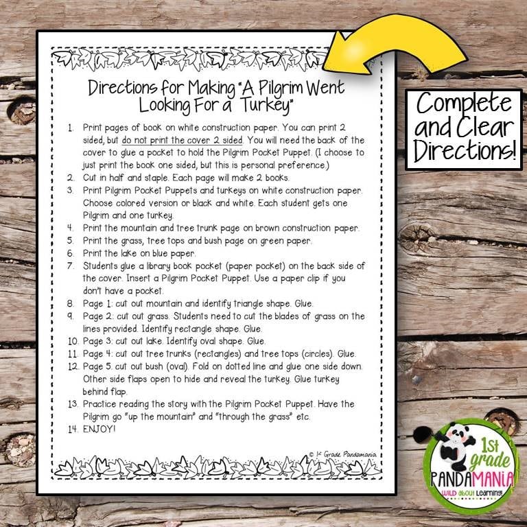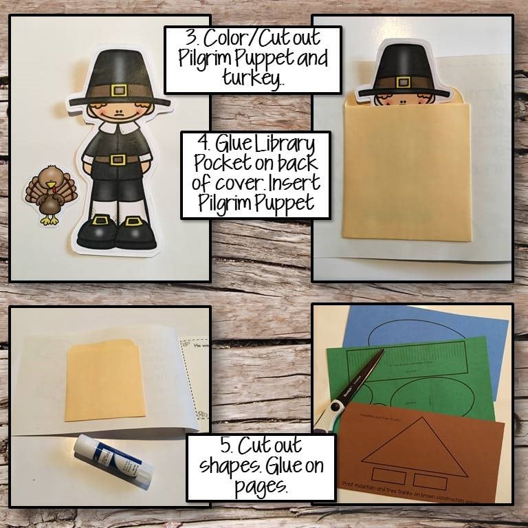 Puppets make reading more INTERACTIVE and FUN. This Thanksgiving activity is definitely one of our 1st grade favorites! Perfect for November. Use the Pilgrim Puppet to help tell the cute story about a Pilgrim who looks for a turkey. Teach positional / directional words, geometric shapes, and following directions. The Pilgrim goes up a mountain, through the grass, around the lake, under the trees, and behind a bush. Store the puppet in a library pocket (or make a pocket with the template that’s included!) that is glued to the back of the book cover. Watch your students read it over and over again!