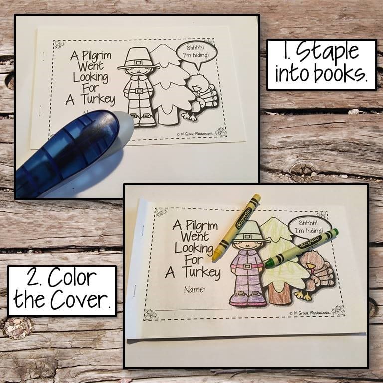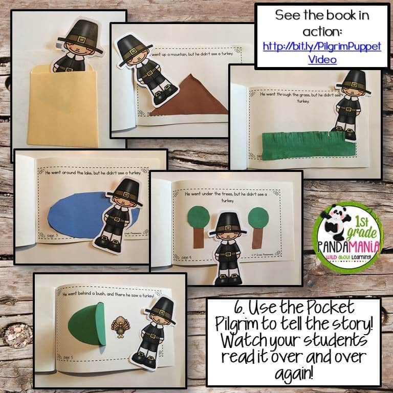 Puppets make reading more INTERACTIVE and FUN. This Thanksgiving fluency activity is definitely one of our 1st grade favorites! Perfect for November. Use the Pilgrim Puppet to help tell the cute story about a Pilgrim who looks for a turkey. Teach positional / directional words, geometric shapes, and following directions. The Pilgrim goes up a mountain, through the grass, around the lake, under the trees, and behind a bush. Store the puppet in a library pocket (or make a pocket with the template that’s included!) that is glued to the back of the book cover. Watch your students read it over and over again!