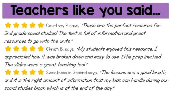 ⭐️⭐️⭐️⭐️⭐️ Courtney P. says: “These are the perfect resource for 2nd grade social studies! The text is full of information and great resources to go with the units.”