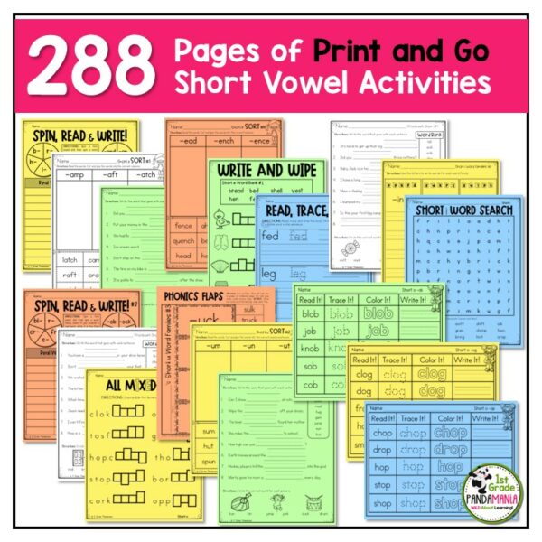 This Targeted Phonics Short Vowel Worksheets BUNDLE includes 288 pages of fun and engaging short vowel worksheets activities. Some are paper/pencil, coloring and others are cut and paste matching and could be used in an interactive notebook for phonics. Perfect for K-2.