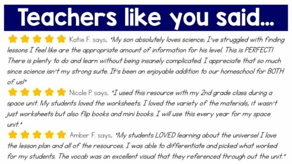 ⭐️⭐️⭐️⭐️⭐️ Nicole P. says, “I used this resource with my 2nd grade class during a space unit. My students loved the worksheets. I loved the variety of the materials, it wasn’t just worksheets but also flip books and mini books. I will use this every year for my space unit.”