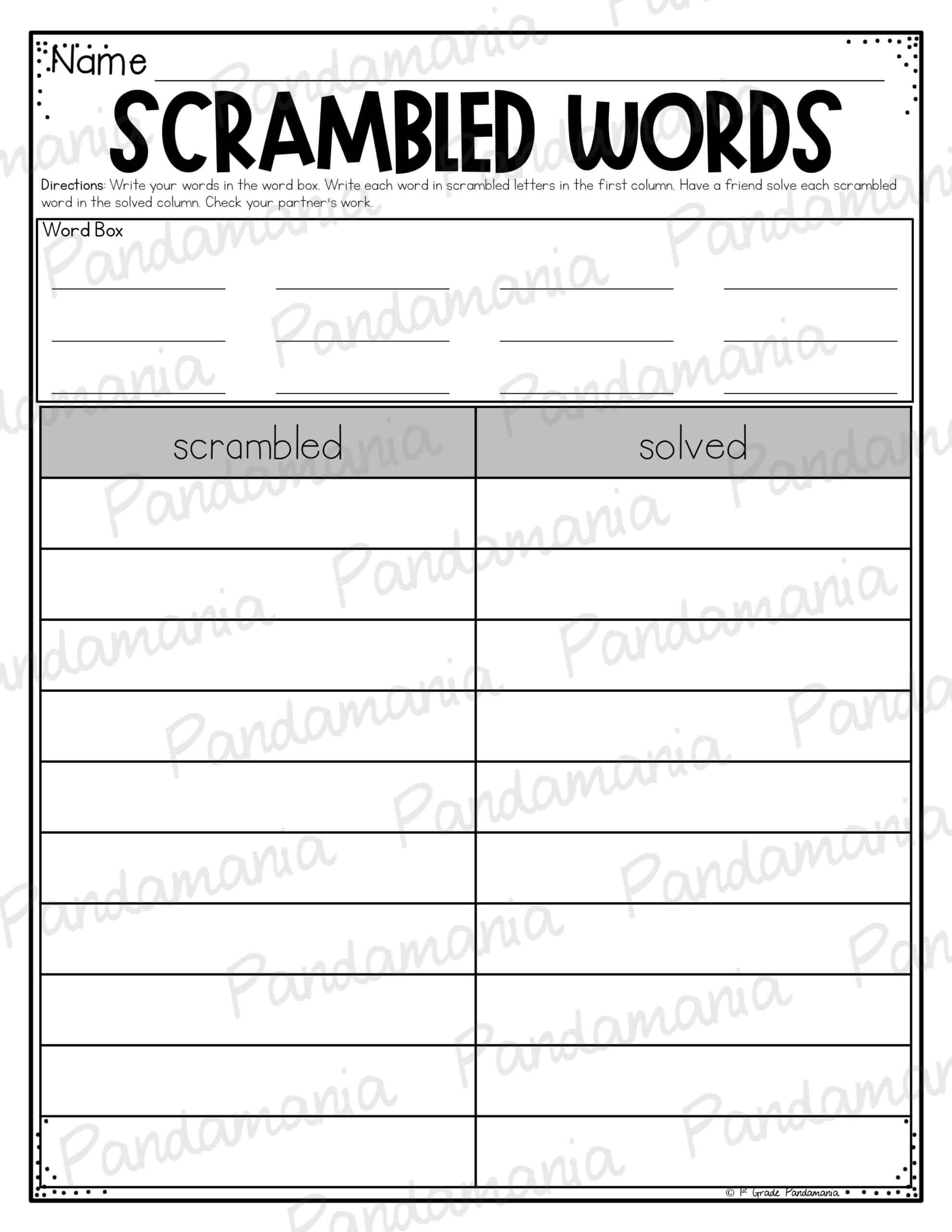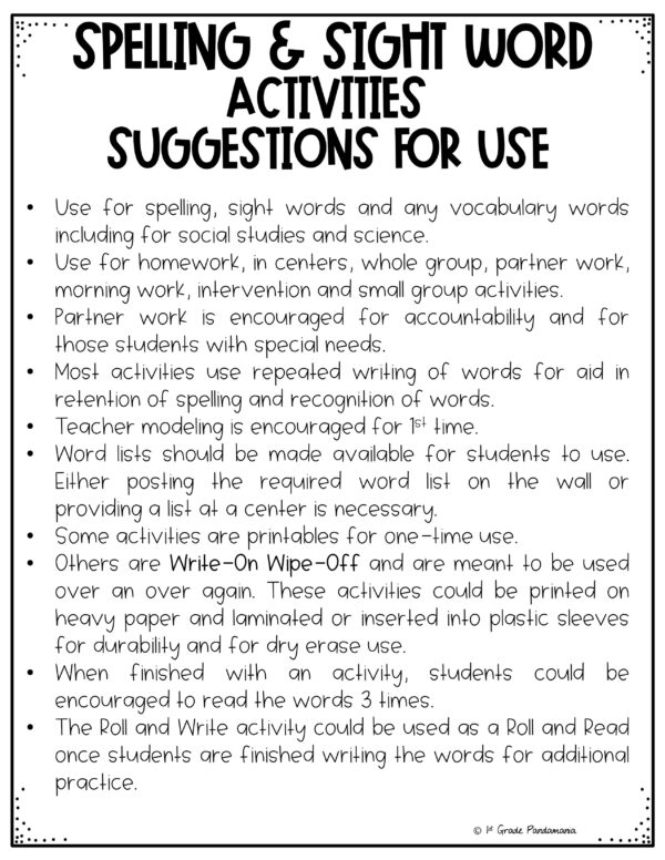 These spelling or sight word activities can be used with any list of 10 words. Just have students (or teacher can) add 10 spelling words, sight words, or vocabulary words, and watch them have fun practicing and reinforcing their skills. Use these activity sheets for homework, centers, guided reading activities and more! Use over and over again all year long. Differentiate with the activities that meet the needs of your students. Please see the preview for details.