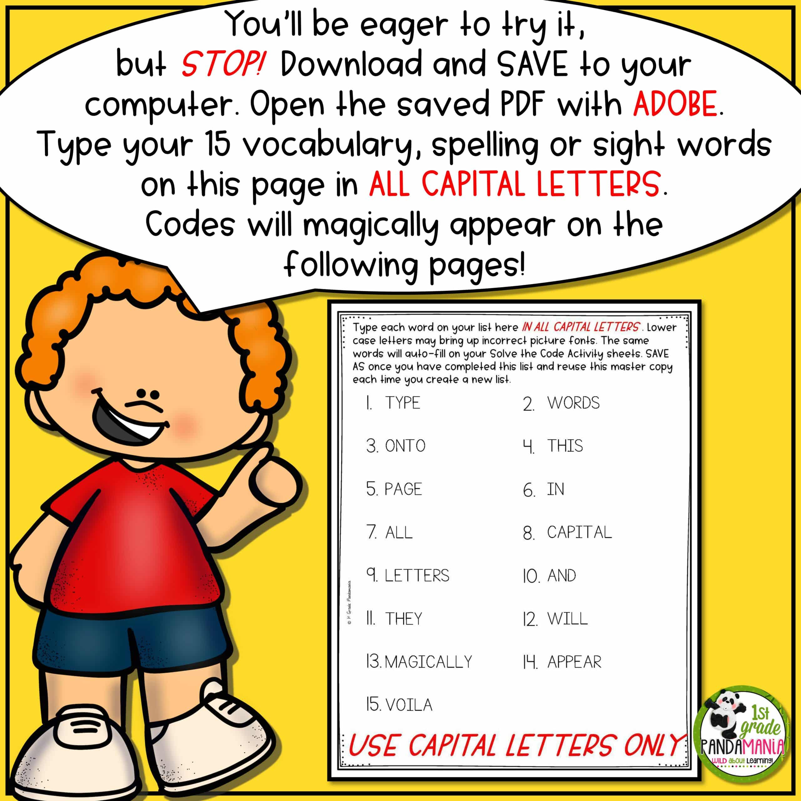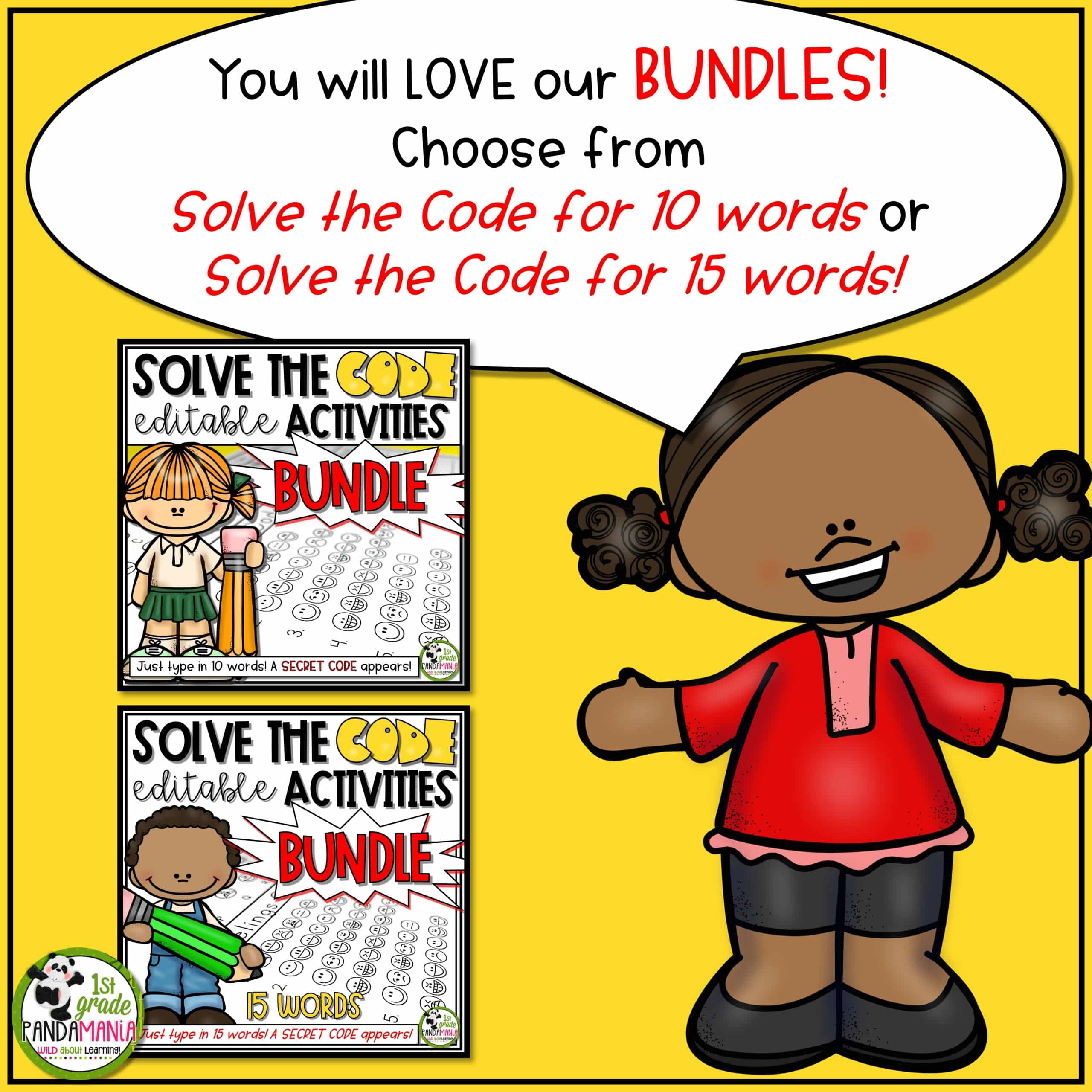 Just type in your weekly spelling, vocabulary, sight words or holiday words list of 15 words and 8 Solve the Secret Code Puzzle Activities will automatically fill, ready to print and be solved! How cool is that? Print only what you want and use over and over all year long!
