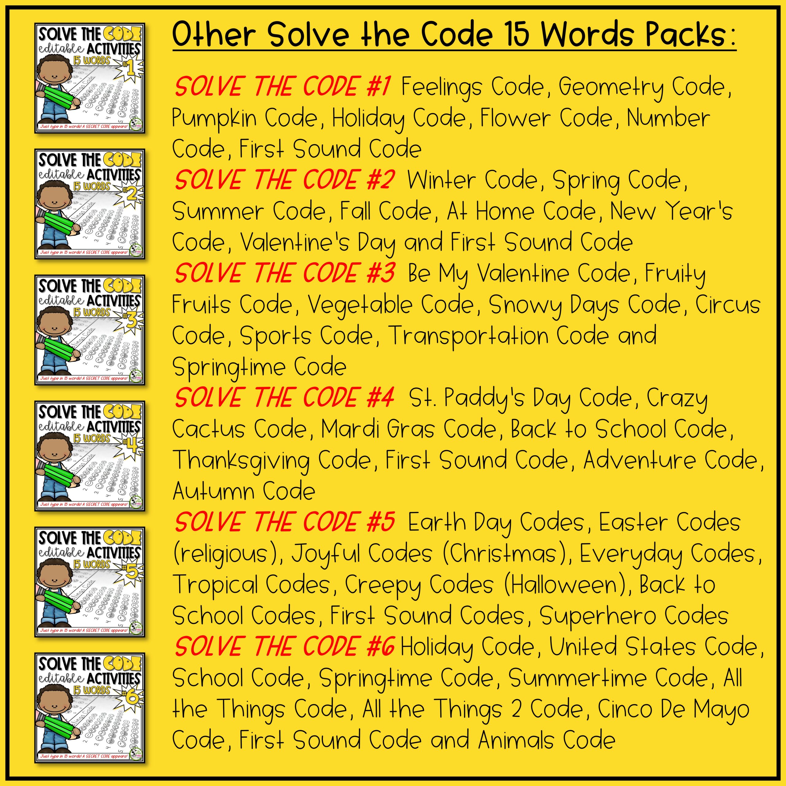 - SOLVE THE CODE 15 Words #5 Earth Day Code, Easter Code (religious), Joyful Code (Christmas), Everyday Code, Tropical Code, Creepy Code (Halloween), Back to School Code, First Sound Code, Superhero Code