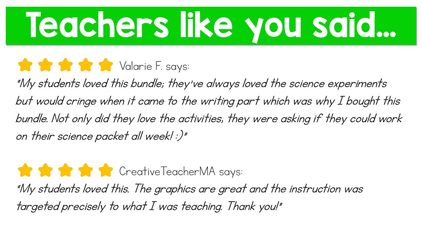 ⭐️⭐️⭐️⭐️⭐️ Valarie F. says: “My students loved this bundle; they’ve always loved the science experiments but would cringe when it came to the writing part which was why I bought this bundle. Not only did they love the activities, they were asking if they could work on their science packet all week! :)”