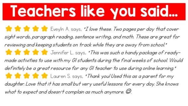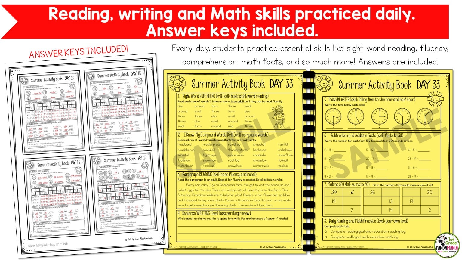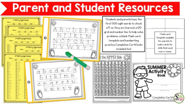 Students complete 2 pages each day for 50 days throughout the break. Routine is key. The first page includes reading, language and writing review activities. The second page includes math review activities. Students also keep reading and math logs where they set and maintain daily goals. Every 10th day is a Math Game Day where students play a fun game to review essential math skills. The back of the book contains resources for students and parents (Fry sight word lists, 120 grid, number line, handwriting pages, and a blank flashcard page to copy and create flashcards as needed.)