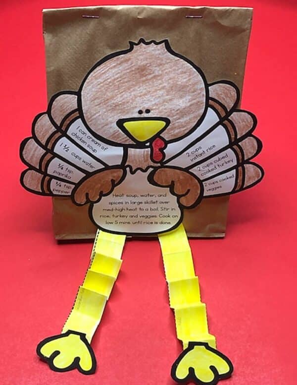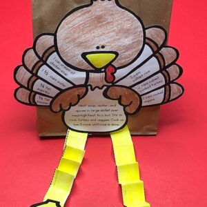 This FREE Thanksgiving activity Turkey Craft includes a recipe for leftovers and can double as a centerpiece! It is perfect for 1st and 2nd grades! Students color, cut out, and glue the turkey to a paper sack. Then a Ziplock bag with 2 cups of instant rice is added to the sack and the paper sack is stapled shut. The Thanksgiving craft can be displayed on Thanksgiving day as a centerpiece, and then the following day, young students can help follow the recipe to make a Turkey and Rice Casserole with leftover turkey. This activity is one of our students’ favorites, and I’m proud for your students to enjoy it as well!