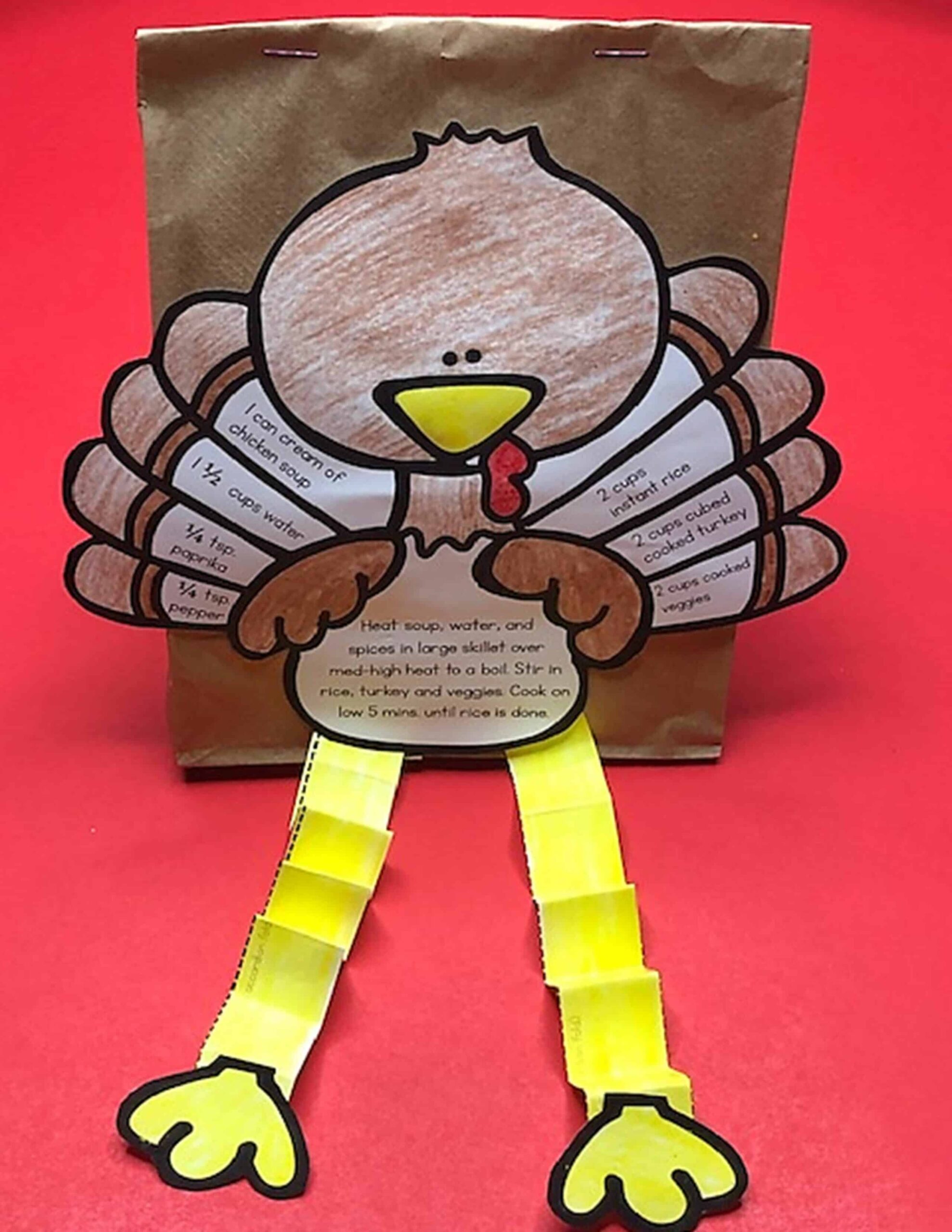This FREE Thanksgiving activity Turkey Craft includes a recipe for leftovers and can double as a centerpiece! It is perfect for 1st and 2nd grades!Students color, cut out, and glue the turkey to a paper sack. Then a Ziplock bag with 2 cups of instant rice is added to the sack and the paper sack is stapled shut. The Thanksgiving craft can be displayed on Thanksgiving day as a centerpiece, and then the following day, young students can help follow the recipe to make a Turkey and Rice Casserole with leftover turkey.
