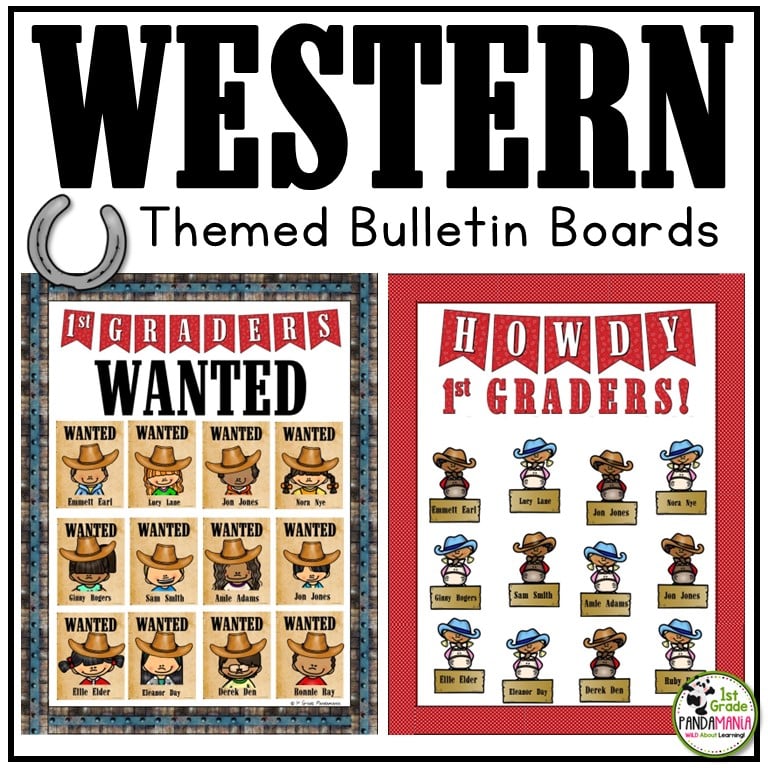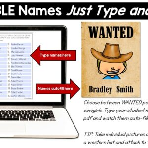 Get ready for back to school with a 293-page Western cowboy and cowgirl-themed and WANTED poster bulletin board with an editable pdf. Just type in your students’ names and they auto-fill onto WANTED posters and/or cowboy and cowgirl labels.