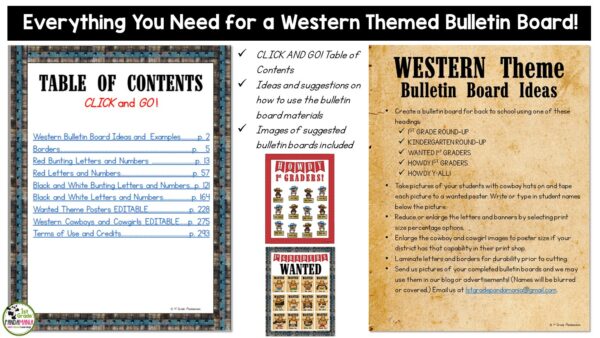 Get ready for back to school with a 293-page Western cowboy and cowgirl-themed and WANTED poster bulletin board with an editable pdf. Just type in your students’ names and they auto-fill onto WANTED posters and/or cowboy and cowgirl labels. Take pictures of your students wearing Western hats and attach to the WANTED posters! Create your own clever bulletin board titles with the A-Z and numbers 0-9 included!