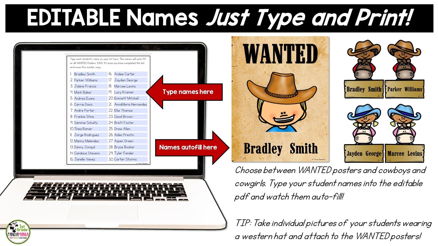 EDITABLE FILLABLE PDF for student names. Just enter names and they auto-fill onto WANTED posters and cowboy/cowgirl labels