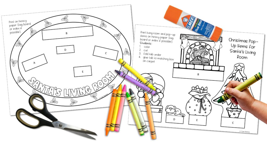 You won’t find this Santa craft anywhere else! Santa’s living room comes to life with pop-up items displayed in front of the fireplace! You can grab this holiday gift just for you and your students at the bottom of this post.