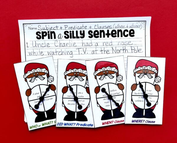 Without even realizing it, your students are writing simple sentences for first graders and are learning about subjects, predicates, and clauses in each holiday sentence they spin! It’s simple to differentiate with this Spin a Silly Simple Holiday Sentence Christmas activity and easy to record on their own sentence writing worksheet!