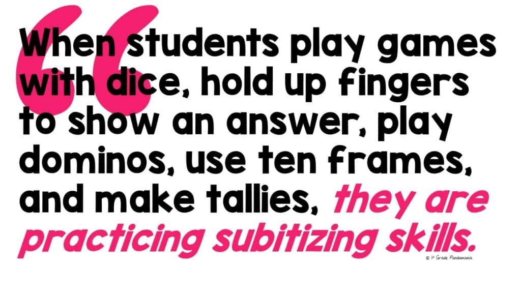 Strong subitizing skills build number sense. That’s why we have students play games with dice, hold up fingers to show an answer, play dominos, use ten frames, and make tallies. These are all ways to practice subitizing! Looking for more ideas? Read more about Number Sense here.