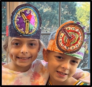 These two cuties made clock crowns that show their favorite time of day! 10:30 is when Emily has recess, and 5:45 is when Marcus has soccer practice!