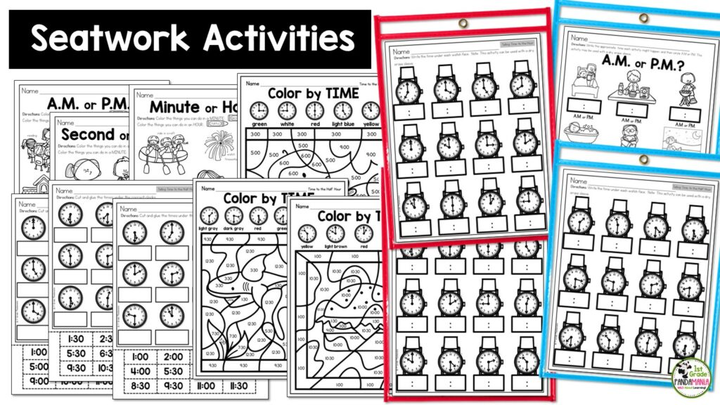 Time-telling worksheets are also a great way to reinforce concepts that are taught. Students cut and paste, color, and write and wipe at centers or small groups!