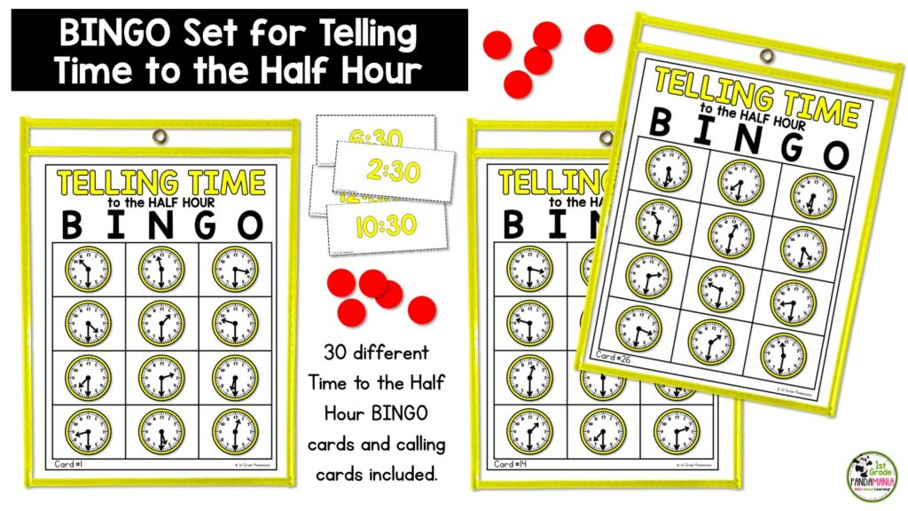 These Telling Time BINGO Games are color-coded by skill: 30 telling time to the hour games are red, 30 telling time to the half-hour games are yellow, and 30 cards with both hour and half-hour times are in blue. Just print and go! Color-coded calling cards are also included.