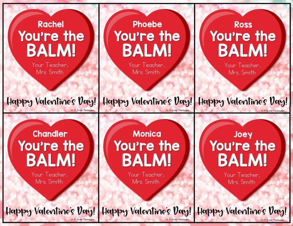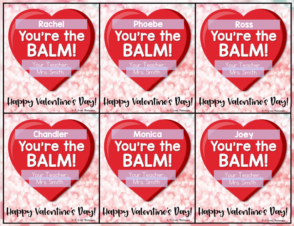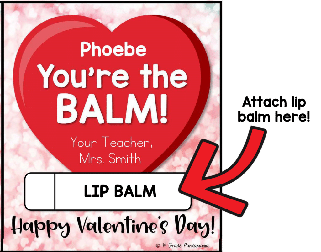 I printed off the Valentine’s Day cards and then made a trip to my favorite dollar tree and purchased 2 lip balms for $1.00. Then I hand-wrote all my students’ names on each lip balm with a Sharpie and hot glued them on the Valentine’s Day card. (The names on the lip balms help when they are dropped or lost)
