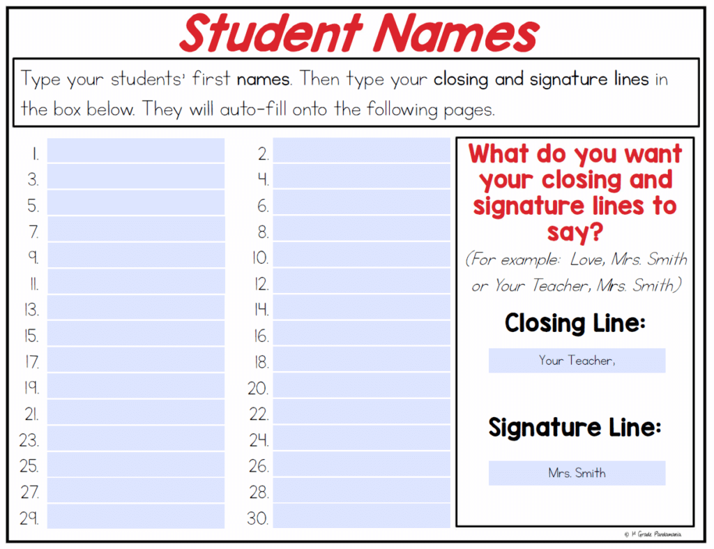 Just type your students’ names, your closing line, and signature line. You may want to say Love, Mrs. Smith or Your Teacher, Mrs. Jones. Whatever you want! Remember that the longer each word is, the smaller it will be when it auto-fills.